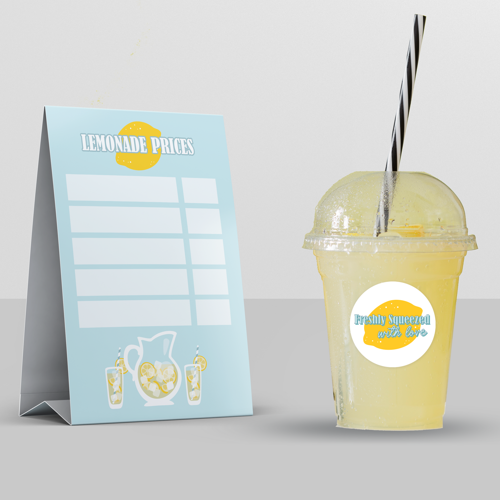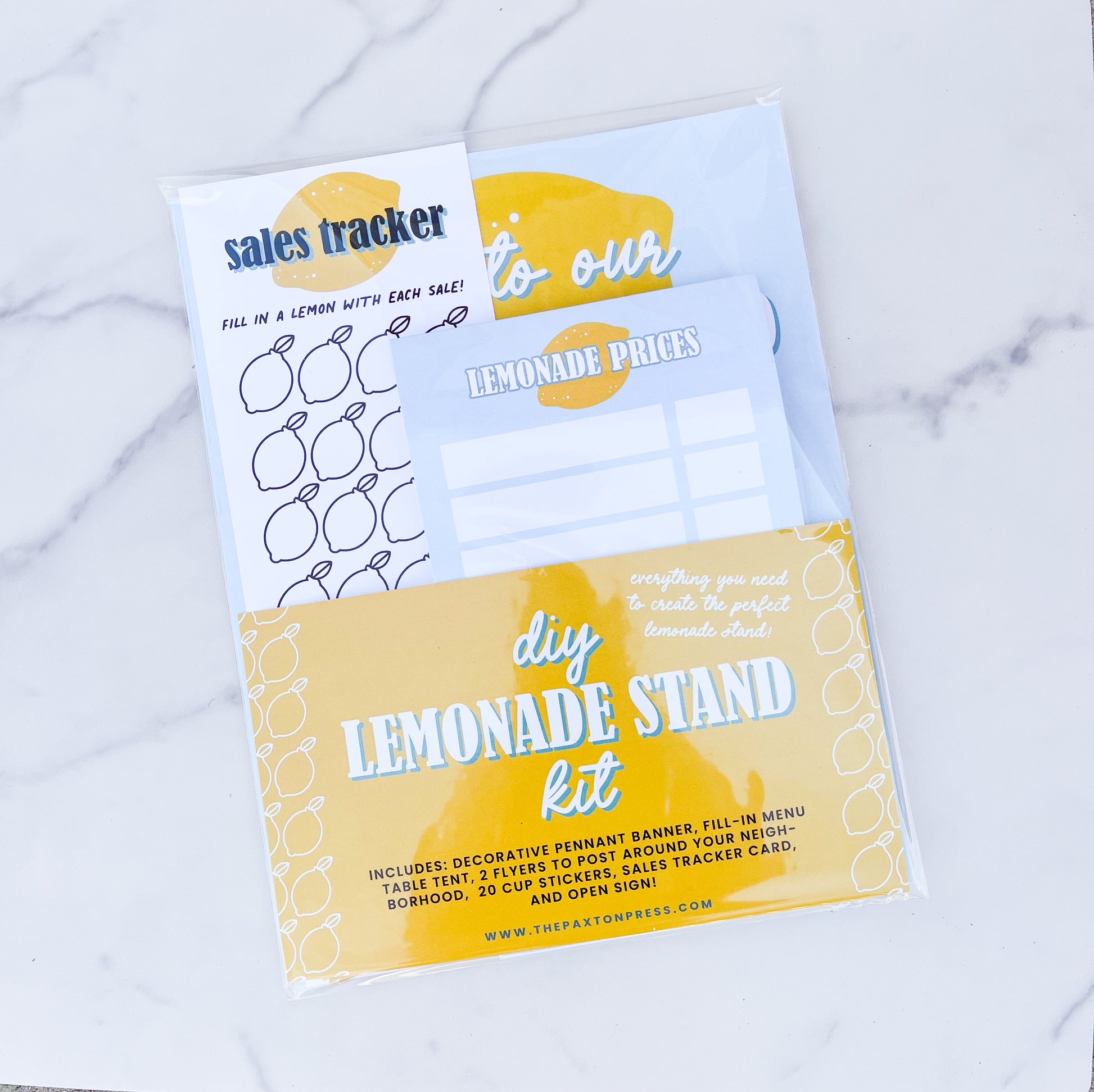 DIY Lemonade stand kit - includes 2 fill-in-the-blank flyers to hang up around your neighborhood, a table tent to write your prices on, a pennant banner that says lemonade, 20 "freshly squeezed with love" stickers for your lemonade cups, an open sign, and a sales tracker for you to fill in each lemon with each sale you make