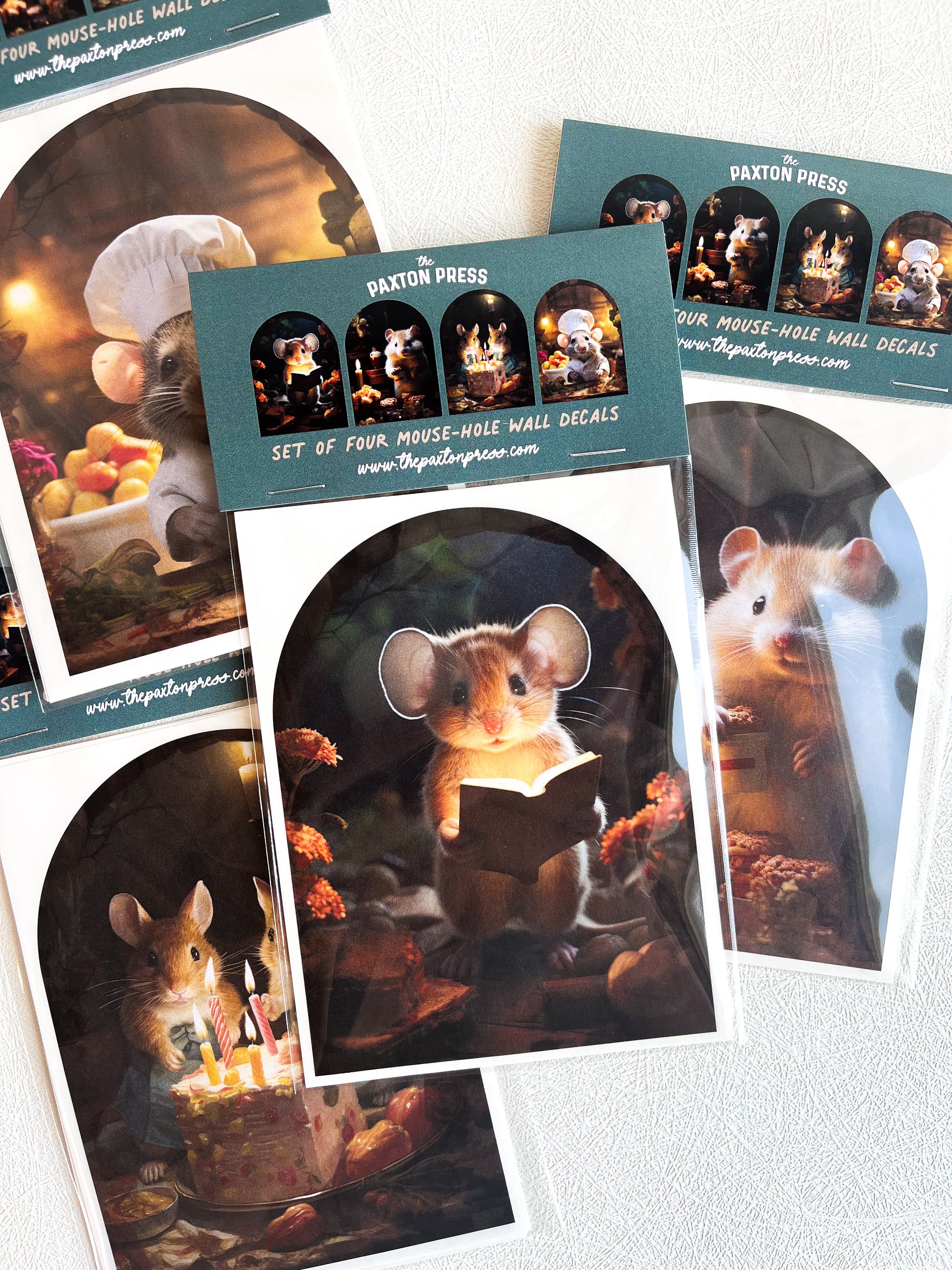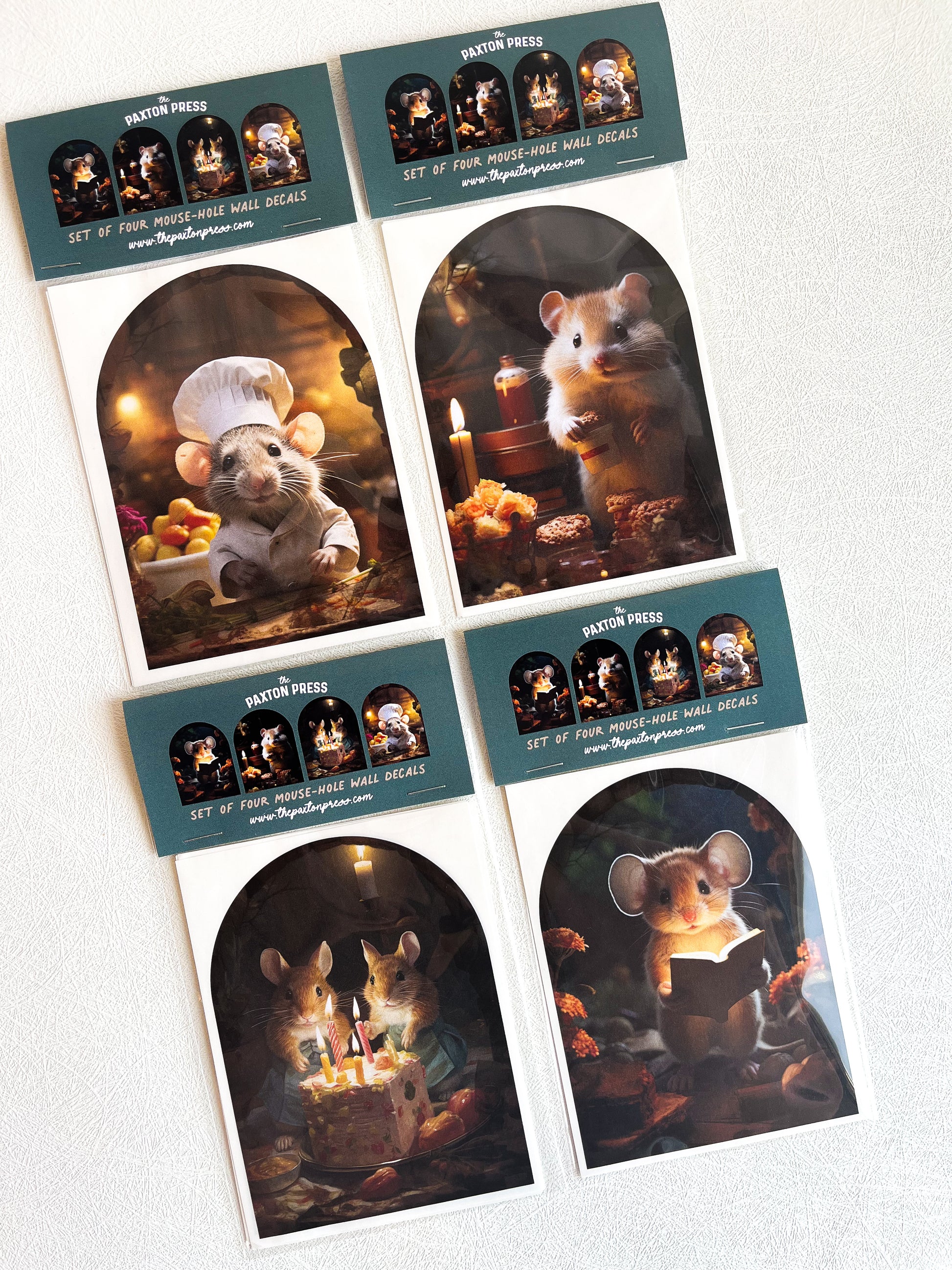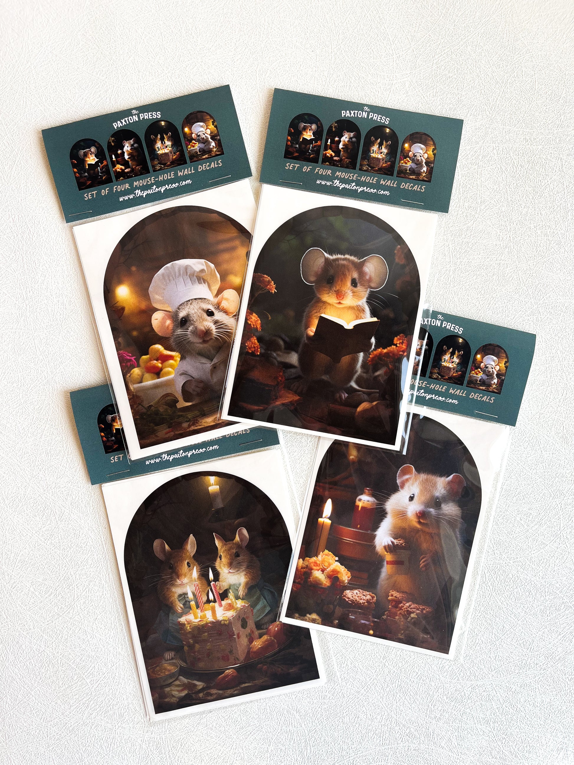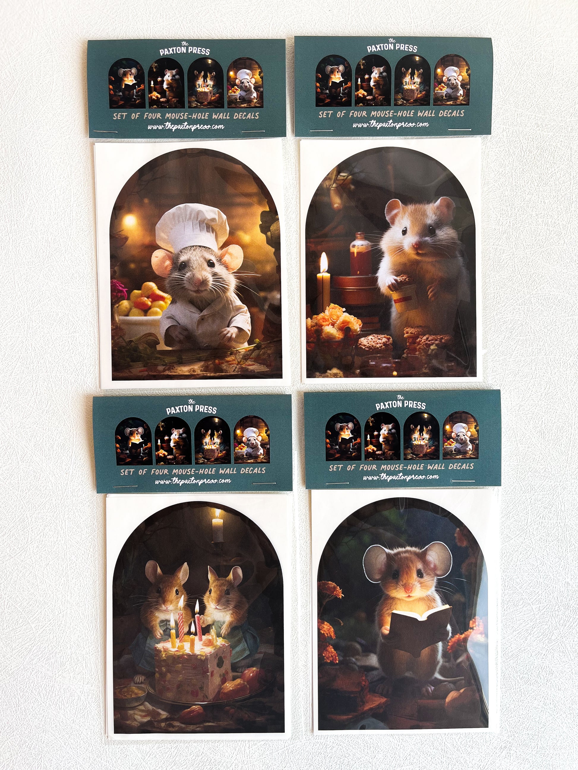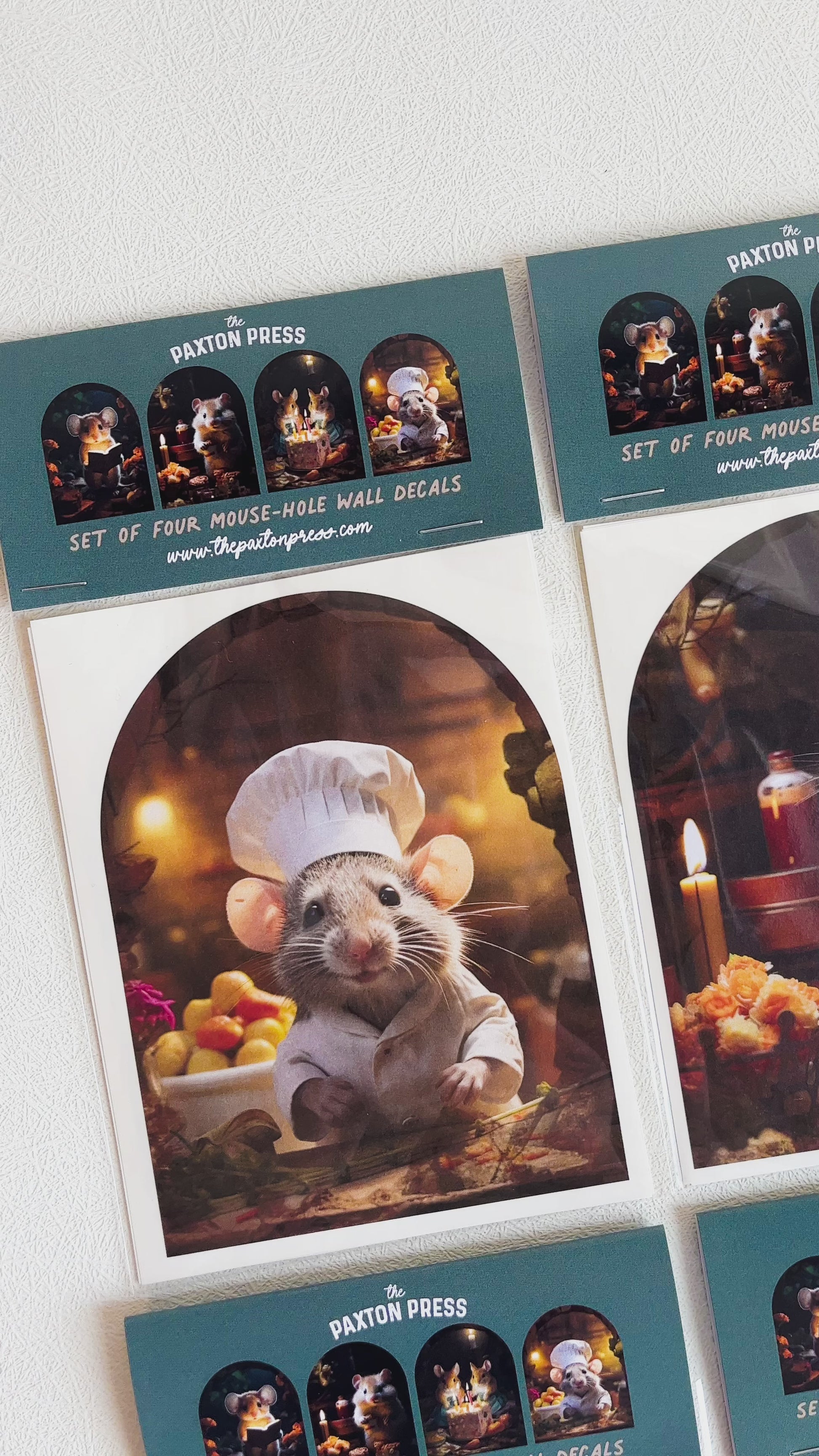 This set of 4 decals will add a touch of whimsy to any room. Transform your walls into a playful scene, perfect for kids' rooms or quirky adults. No mouse traps necessary!