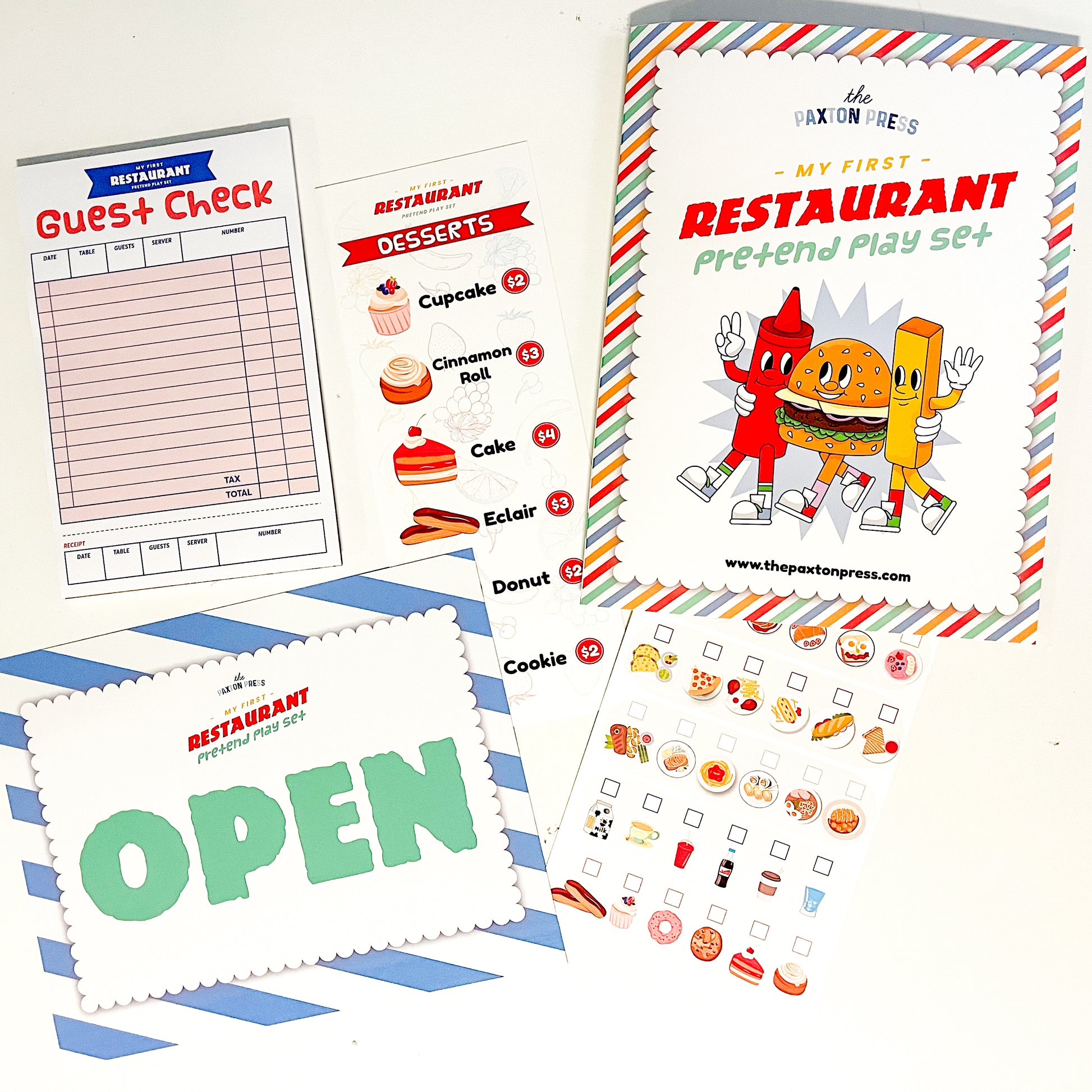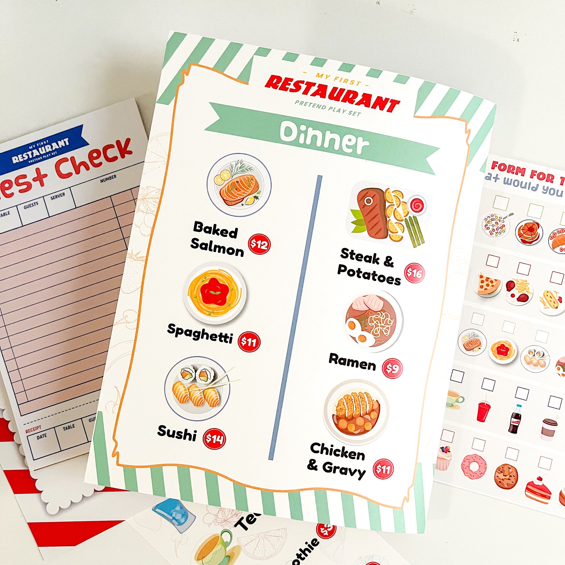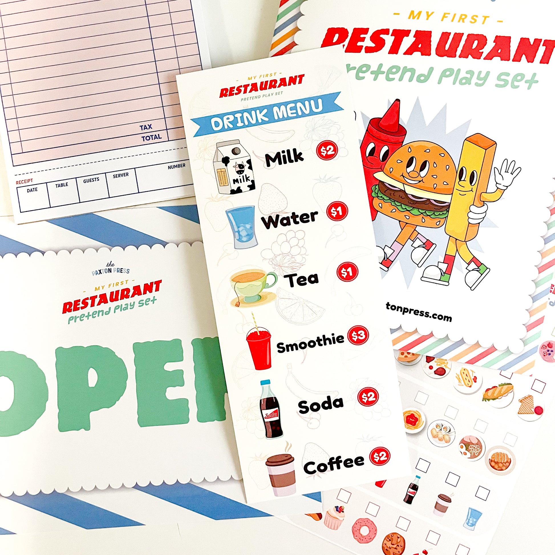 pretend play, play kitchen, restaurant, preschool activities, play food, pretend play set, homeschool activity, printable, kids pretend play, play set, homeschool, montessori play, diner, kids activity kit, childs pretend play, dramatic play