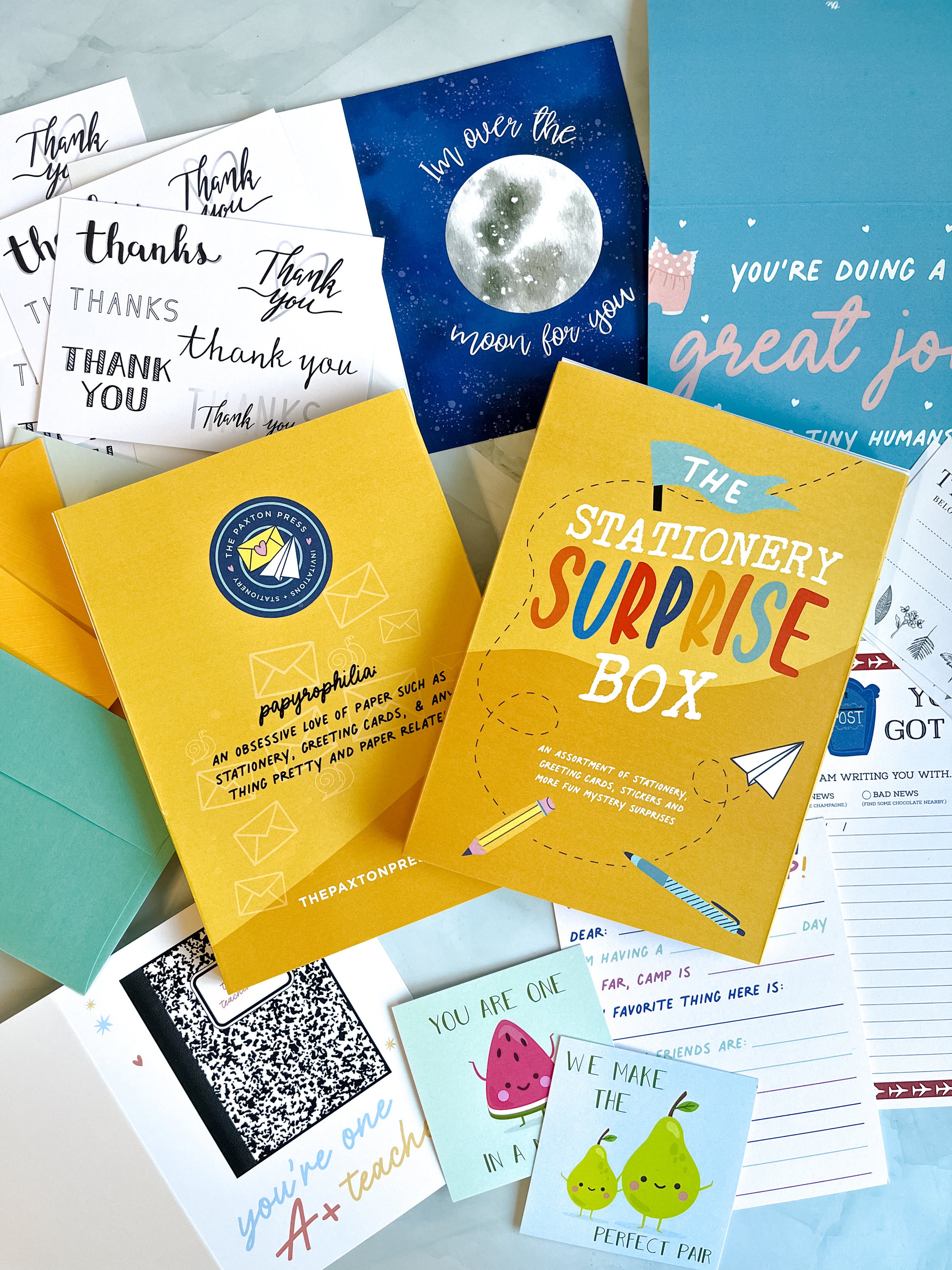 Do you or someone you love have a stationery obsession? Do you like collecting and using pretty greeting cards, envelopes and cute stationery stuff? If you answered yes to either of these questions, this Stationery Surprise Box is for YOU!