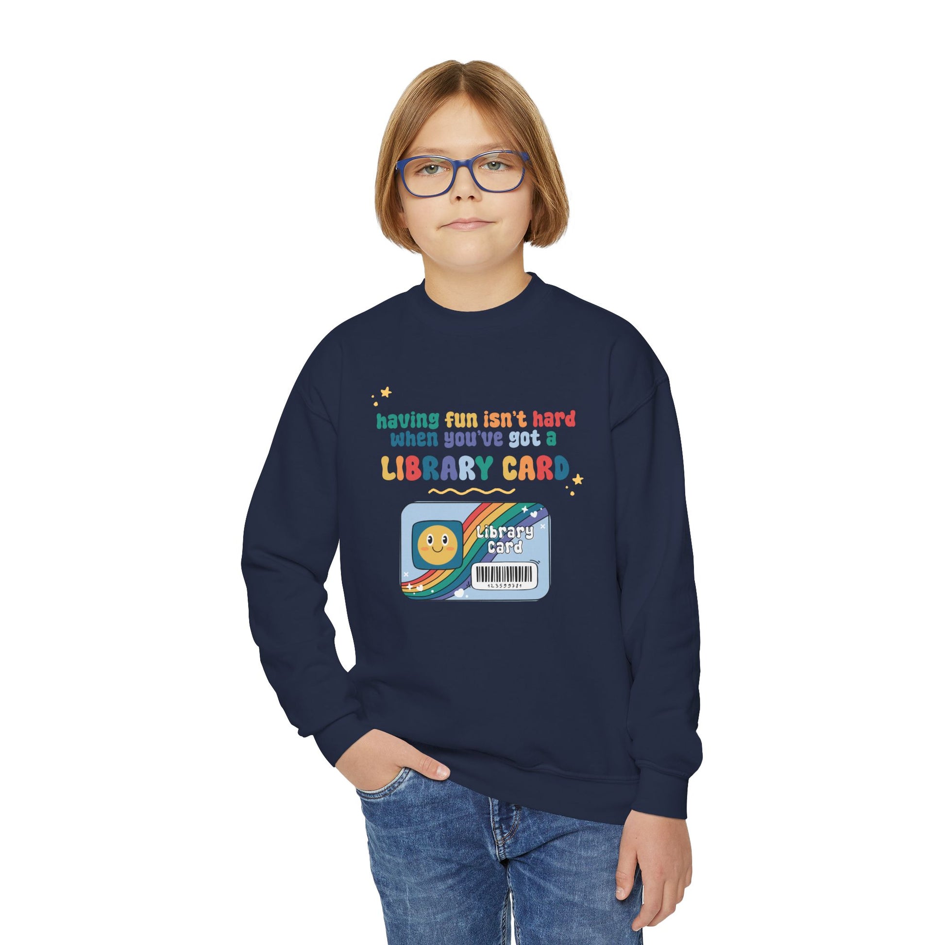 Youth Crewneck Sweatshirt — "Having Fun Isn’t Hard When You’ve Got a Library Card" Retro Library Card Design